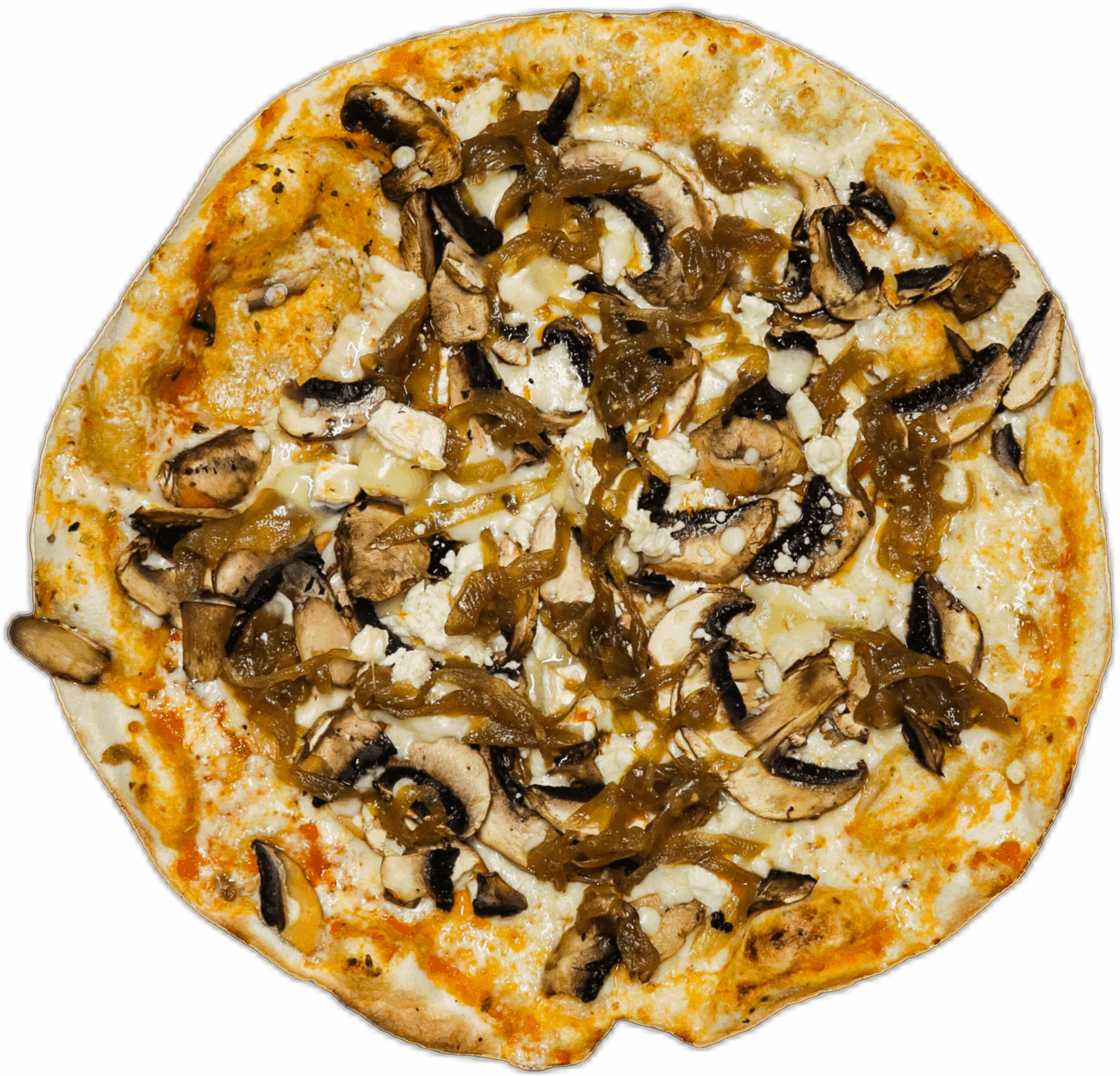 Xampinyons, ceba caramellitzada i formatge de cabra